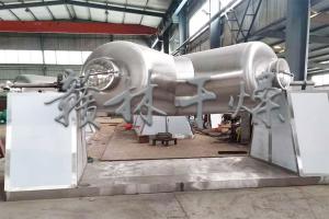 VHJ形混合機利用混料機二圓柱筒長度不相等,形成不對稱,當混料機轉動時物料從分解到結合再分解,由于物料平面不同,也有橫向力,又有推動物料橫向交流,每轉動一圈橫向力越25%的物料從一個筒體流向另一個桶體,這樣物料橫向徑向混合,分解結合分解結合反復的相互進行,使得物料達到混合作用。